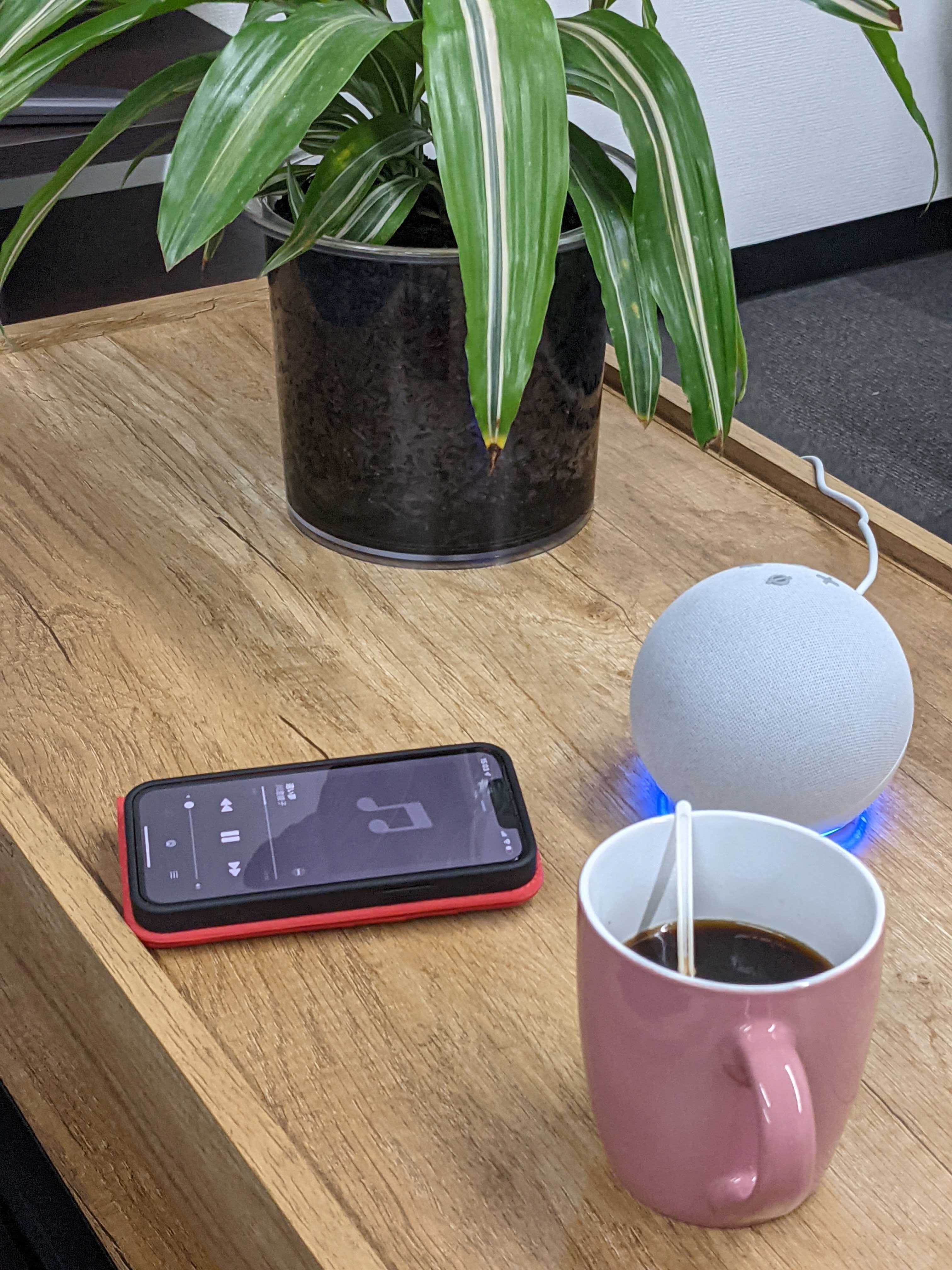 オフィス緑化に取り組んでいるため、緑が増えてきています。最終目標はオフィスで鳥を飼うことです。また、始業・終業時には音楽が流れ、オンオフの切り替えを促されます。